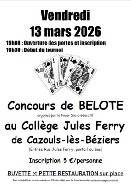 Par admin jules-ferry-cazouls-les-beziers2, publié le jeudi 19 février 2026 10:14 - Mis à jour le jeudi 19 février 2026 10:1513 mars 2026 à 19h30 concours de belote organisé par le FSE du collège. -